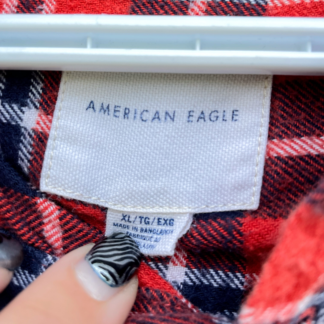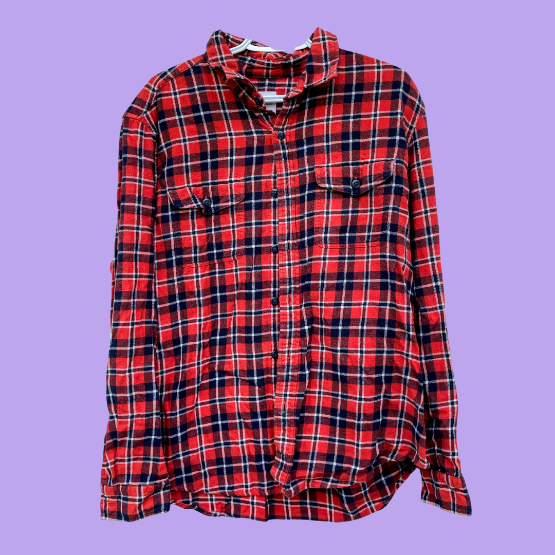 This relaxed fit red and navy plaid button-up flannel shirt features chest pockets and a bold printed message on the back, perfect for casual layering and classic style.