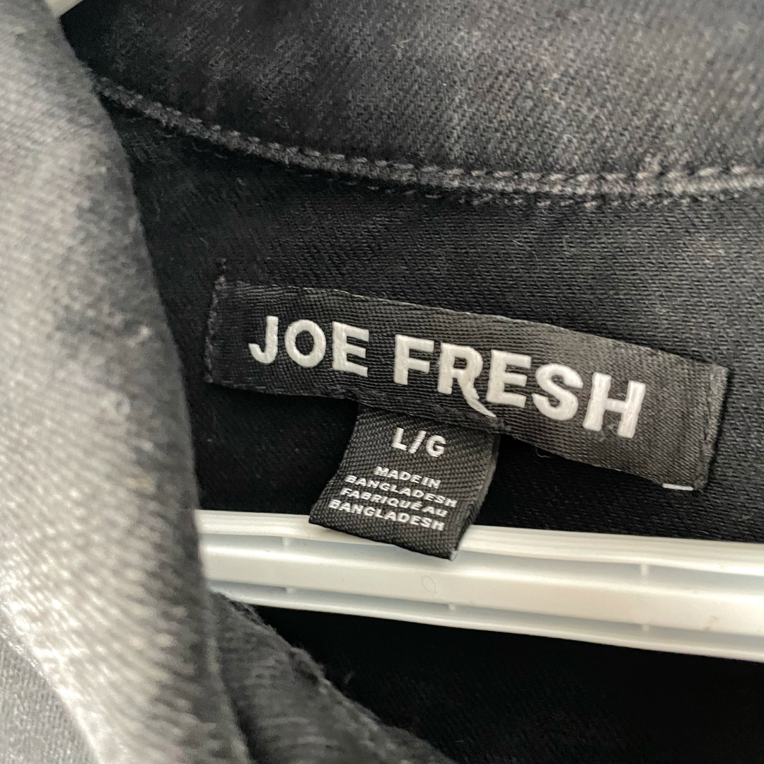 This black denim jacket features a bold hand painted design on the back panel, mixing a checkerboard pattern with a flowing blue wave and small white star details for a striking visual effect. The jacket has a slightly cropped fit with utility-style front pockets and button closures.